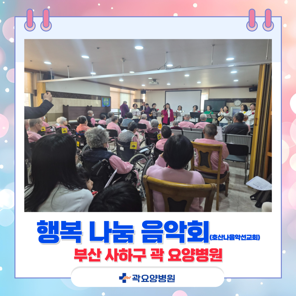 곽요양병원은 지난 11월 23일 오후 2시, 5층 회의실에서 호산나음악선교회와 함께 ‘행복나눔음악회’를 개최했습니다.
